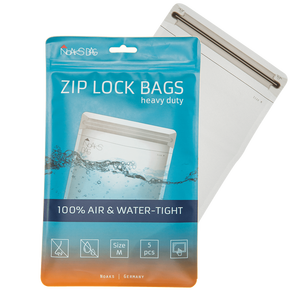 Die Noaks Bags bieten absolut sicheren Schutz vor schädigenden Umwelteinflüssen wie Wasser, Regen, Sand, Schmutz und Schnee. Das innovative, 100 mµ starke Verbundmaterial garantiert höchste Stabilität und eine lange Lebensdauer. Aufgrund des besonderen Verschlusses mit unserer speziellen Doppellippentechnik bleiben Ihre Wertsachen selbst dann geschützt, wenn eine Lippe nicht richtig verschlossen wurde. Die Festigkeit des Verschlusses garantiert, dass er sich nicht versehentlich öffnet.